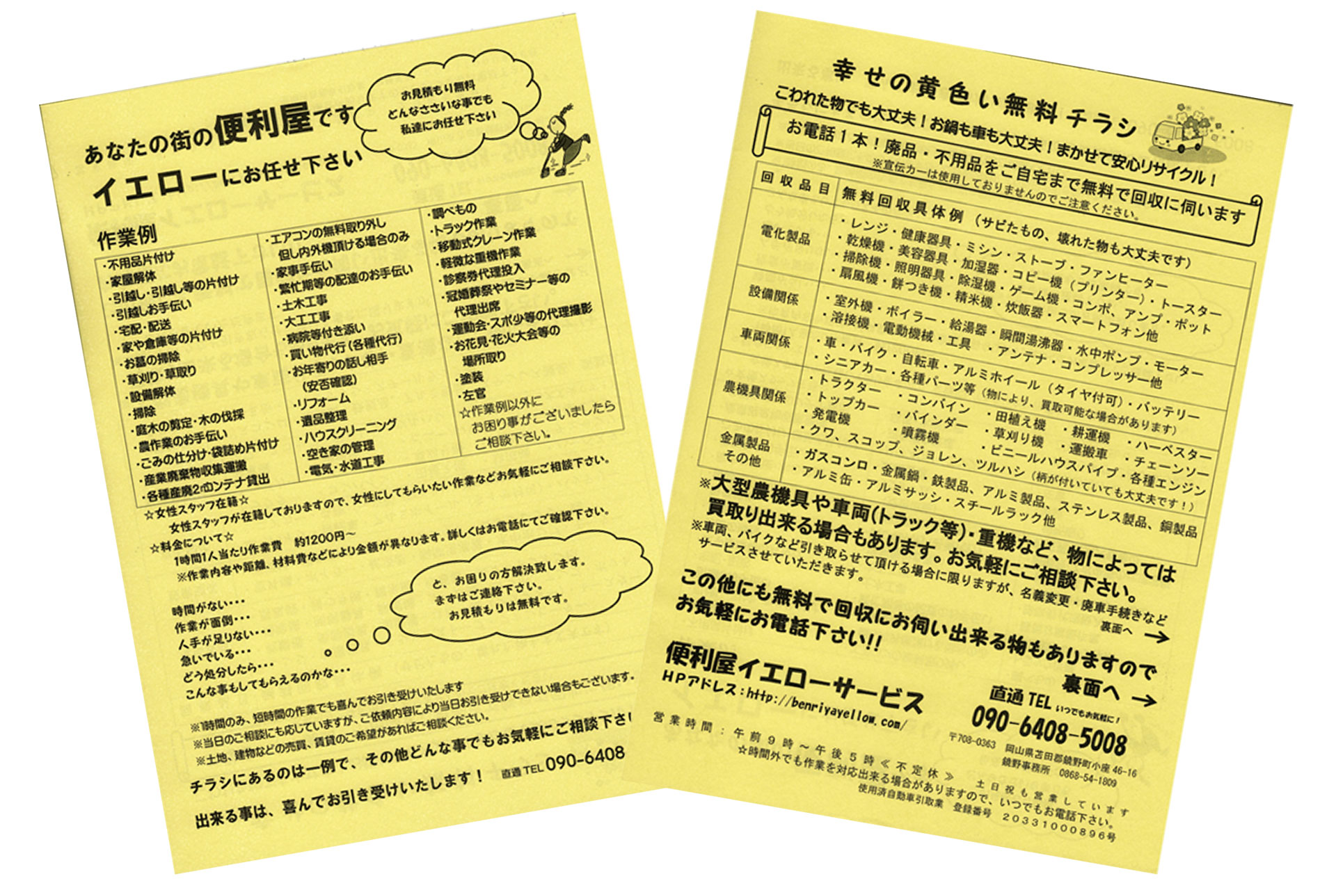 便利屋イエローサービスは今から6年前、平成20年(2008年)に鏡野廃品リサイクルセンターとして鏡野町を中心に宣伝カーを使用せず、一軒一軒ご自宅にお伺いして「黄色のチラシ」を配布し、お声をかけさせていただいておりました。当時から高齢化社会や地域の過疎化が社会問題となっており、お年寄りの方やお仕事で忙しい方に何か力になれるのではないか、手助けやお役に立てることはないかと思い便利屋としての事業をスタートしたのが始まりでした。